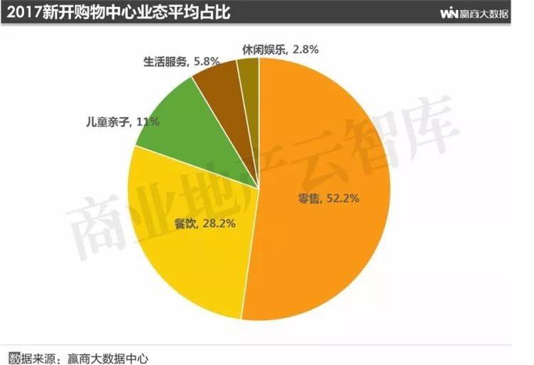 整體來看,2017年開業(yè)的購物中心,各類業(yè)態(tài)占比為:零售52.2%、餐飲28.2%、兒童親子11%、生活服務(wù)5.8%、休閑娛樂2.8%。