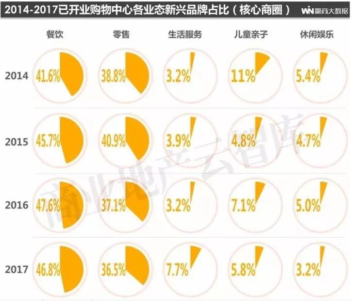 2014-2017年,核心商圈購物中心進(jìn)駐的餐飲、生活服務(wù)新興品牌占比上漲明顯,零售、休閑娛樂新興品牌占比呈下降趨勢,兒童親子新興品牌占比在2015-2017年略有回落;