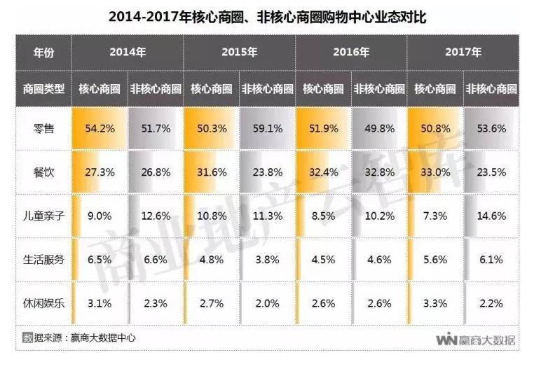 2014-2017年核心/非核心商圈各業(yè)態(tài)占比有何不同?