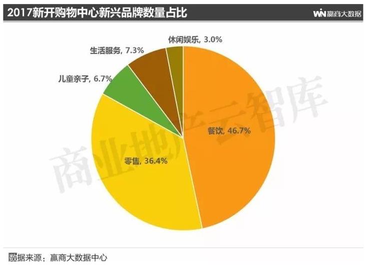 在2017年新開業(yè)購物中心中,整體業(yè)態(tài)占比為:零售52.2%、餐飲28.2%、兒童親子11%、生活服務(wù)5.8%、休閑娛樂2.8%;各業(yè)態(tài)進(jìn)駐的新興品牌占比為:餐飲46.7%、零售36.4%、兒童親子6.7%、生活服務(wù)7.3%、休閑娛樂3%。