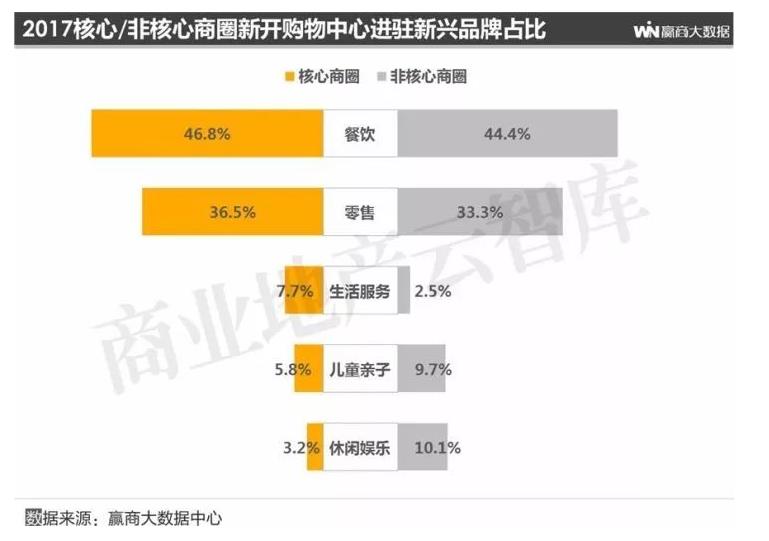 ?2017年核心商圈、非核心商圈購物中心進(jìn)駐的新興品牌占比