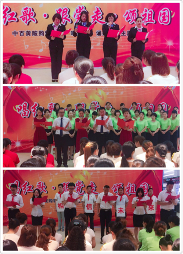 青春的6月,為迎接中國共產(chǎn)黨96歲生日,加強(qiáng)廣大黨員干部職工的愛國主義精神,結(jié)合上級(jí)黨組織七一紀(jì)念活動(dòng)安排及集團(tuán)工會(huì)“唱響紅色歌曲 傳承紅色經(jīng)典 逐夢(mèng)中百新旋律”主題紅歌大賽,黃陂購物中心黨支部、工會(huì)支會(huì)于6月28日在商場(chǎng)一樓中庭,開展了一次別開生面的“唱紅歌 跟黨走 頌祖國”主題實(shí)踐活動(dòng)!