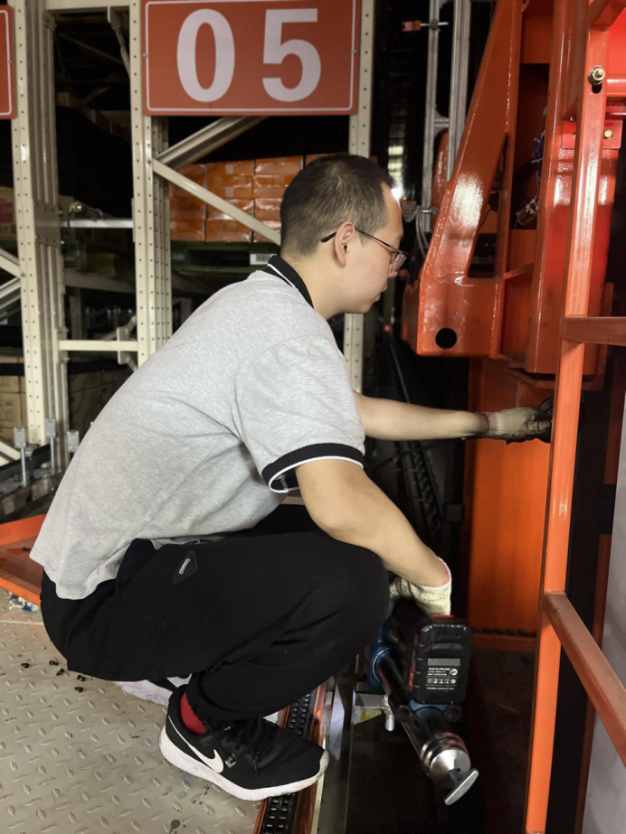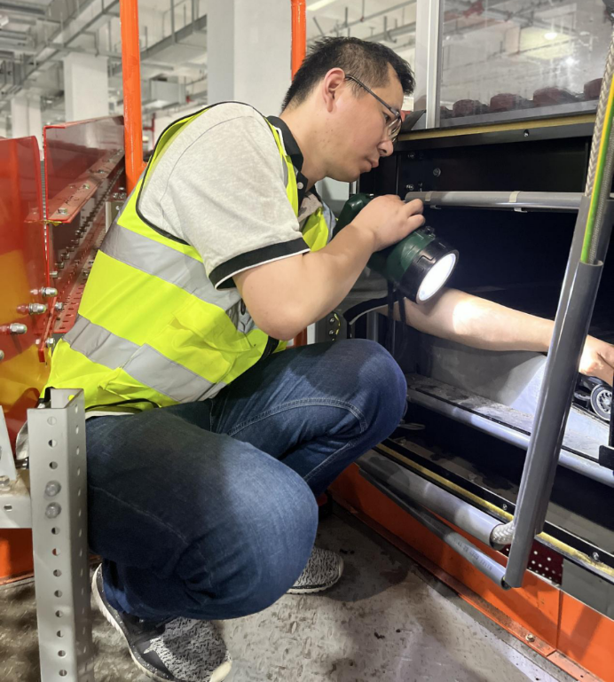 在江夏常溫中央倉設備檢修現場,工程設備部電控系統(tǒng)維修工程師趙金鵬按檢修計劃分組對現場智能化設備進行加油潤滑、拆機緊固、更換易損配件等檢修操作。時間緊、任務重、高強度的作業(yè)使得他全身工作服濕透,盡管揮汗如雨,但他始終全神貫注投入到工作中,第一時間完成了檢修作業(yè)。