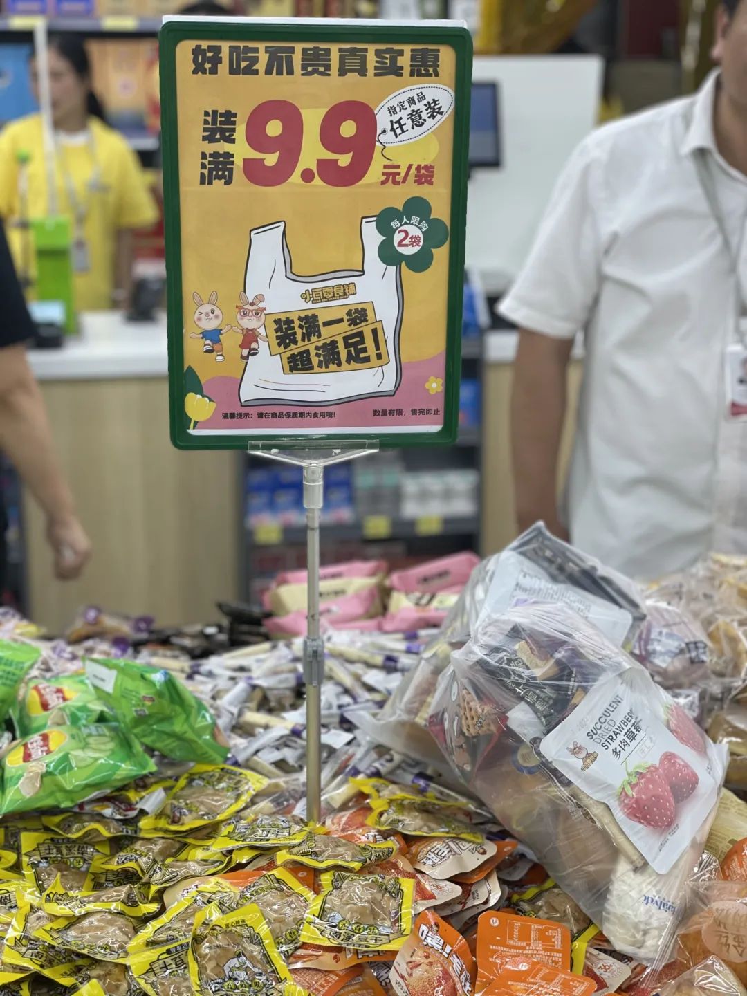 記者在現(xiàn)場看到,小百惠折扣店主打“硬折扣”,民生商品價格較市場價下探20%至30%,以“真低價”吸引消費者。生鮮區(qū)中,優(yōu)質(zhì)帶魚每500g售價較市場價低25%;洗護專區(qū)中,海飛絲500ml洗發(fā)水僅售25元,較傳統(tǒng)超市便宜30%。開業(yè)現(xiàn)場,裝滿9.9元一袋專區(qū),成為流量擔當,擠滿了人。市民李女士一邊往食品袋里壓面包,一邊感嘆,“太劃算了。”