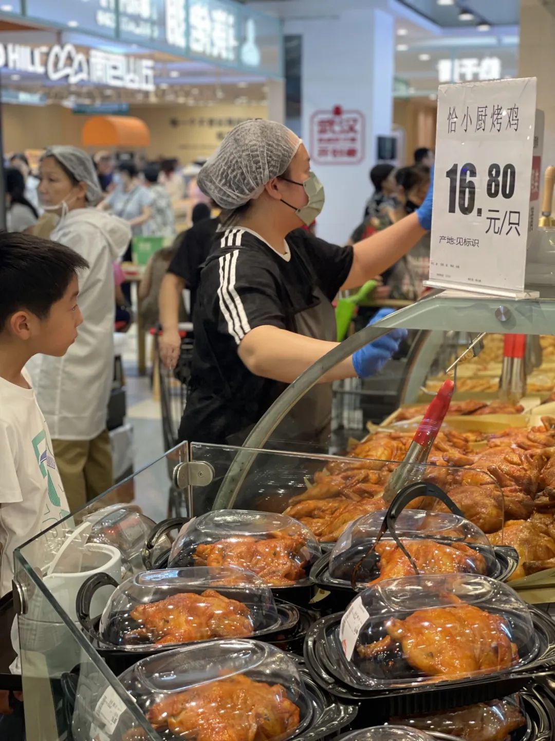 采購了烤雞、應季小龍蝦等熟食的趙先生,盛贊熟食半成品選擇多,方便做快手菜。天熱了不想做飯,他剛?cè)ス淞酥邪俅笫程?,十幾元就能吃到葷素搭配,新鮮、便捷。