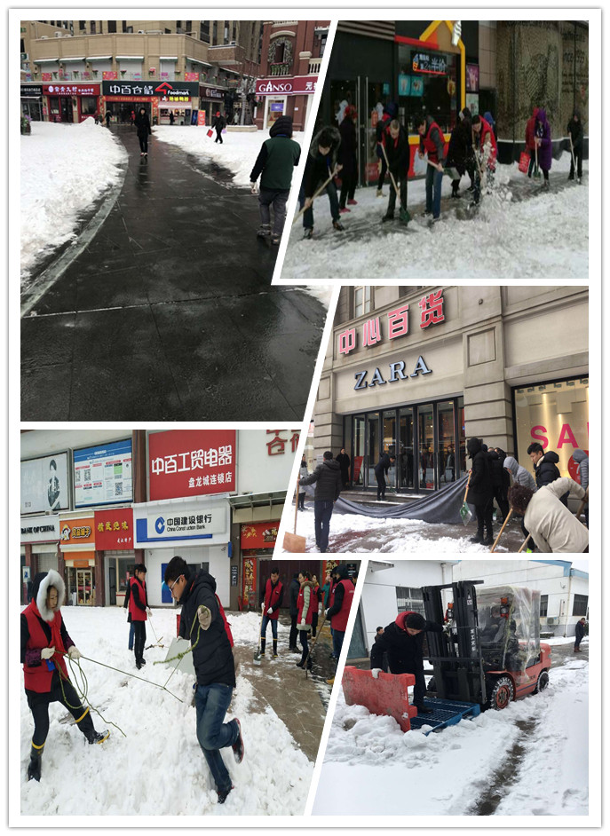 集團(tuán)各公司及各門店積極啟動(dòng)預(yù)案工作,在各負(fù)責(zé)人的帶領(lǐng)下人人提鍬帶鏟分工協(xié)作,冒著風(fēng)雪,在各自門前清掃著道路。為了行人及車輛的行走、行使安全,大家在門前、坡道處,行車處鋪墊上了地毯和防滑布袋。通過大家的通力合作,很快的為顧客開辟出安全而寬敞的行走購(gòu)物通道和車輛安全通道,大家個(gè)個(gè)哈著熱氣,流露著輕松的笑容,冰冷的大地經(jīng)過大家辛苦勞動(dòng)使得熱氣升騰。